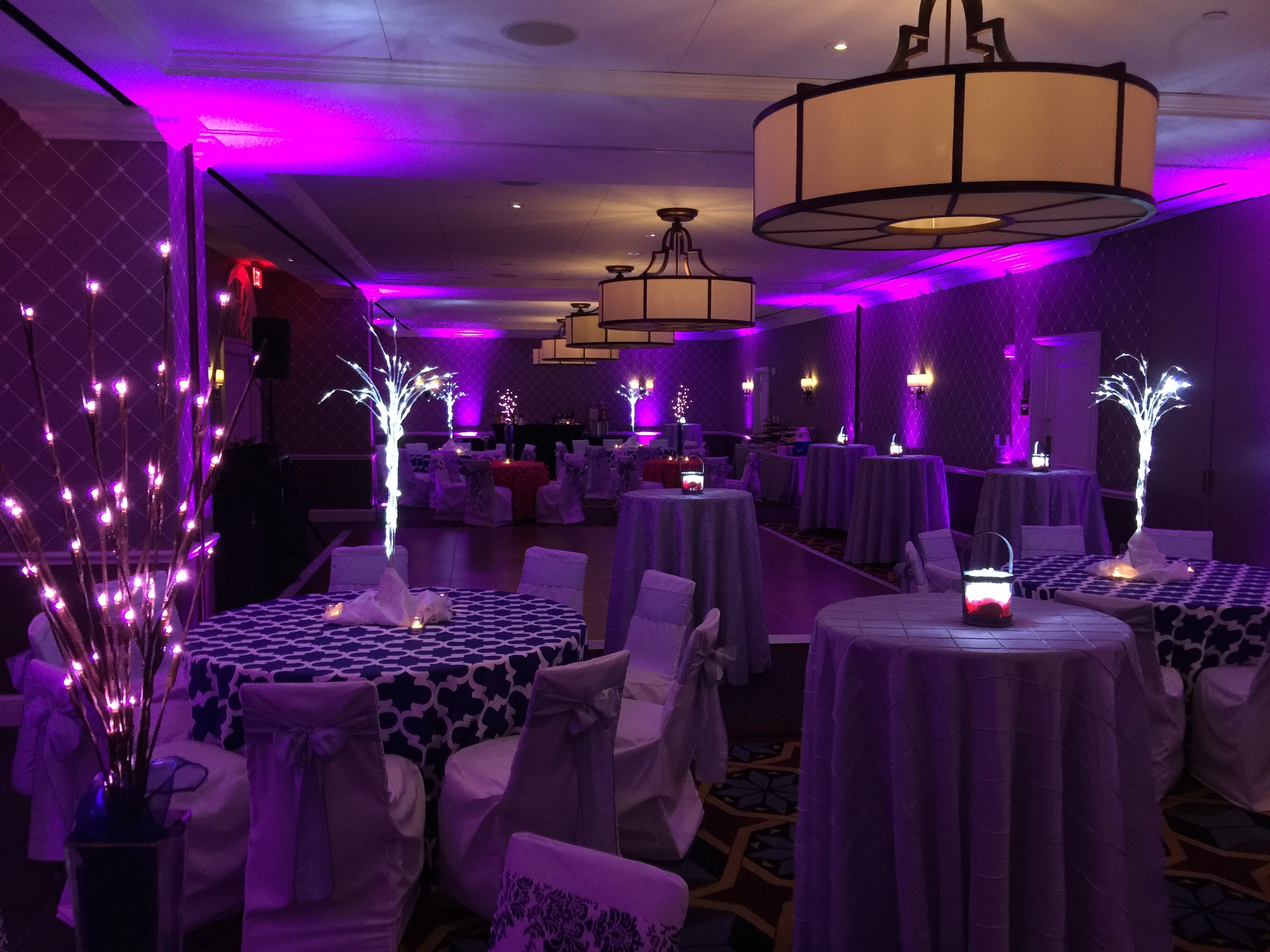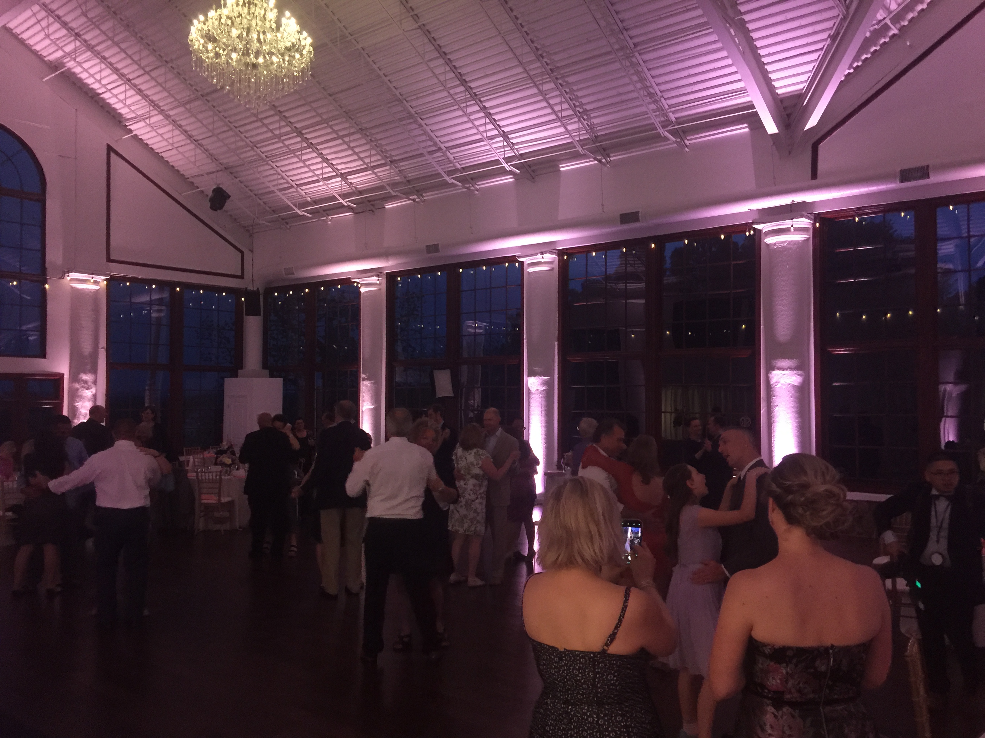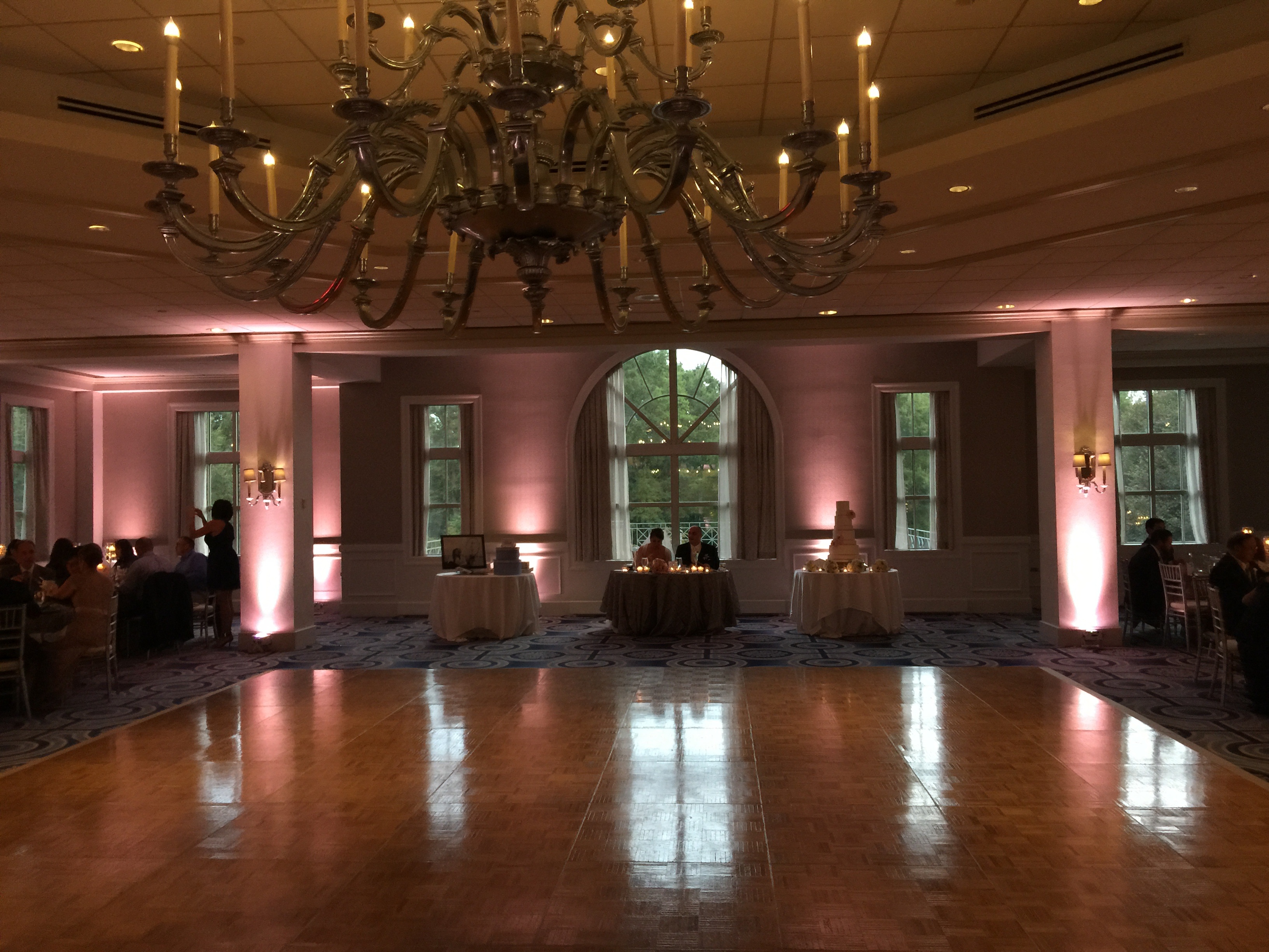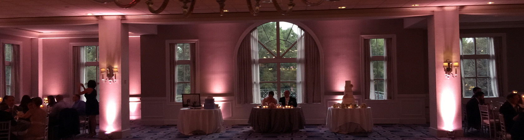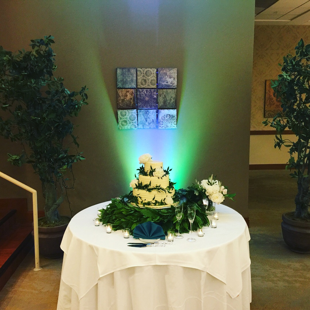 In the wedding video below is a sample of my uplighting moving to the music and changing colors. A great way to add energy to a room for late night dancing. Please note during dinner the uplights will be set on 1 color to create an elegant atmosphere.